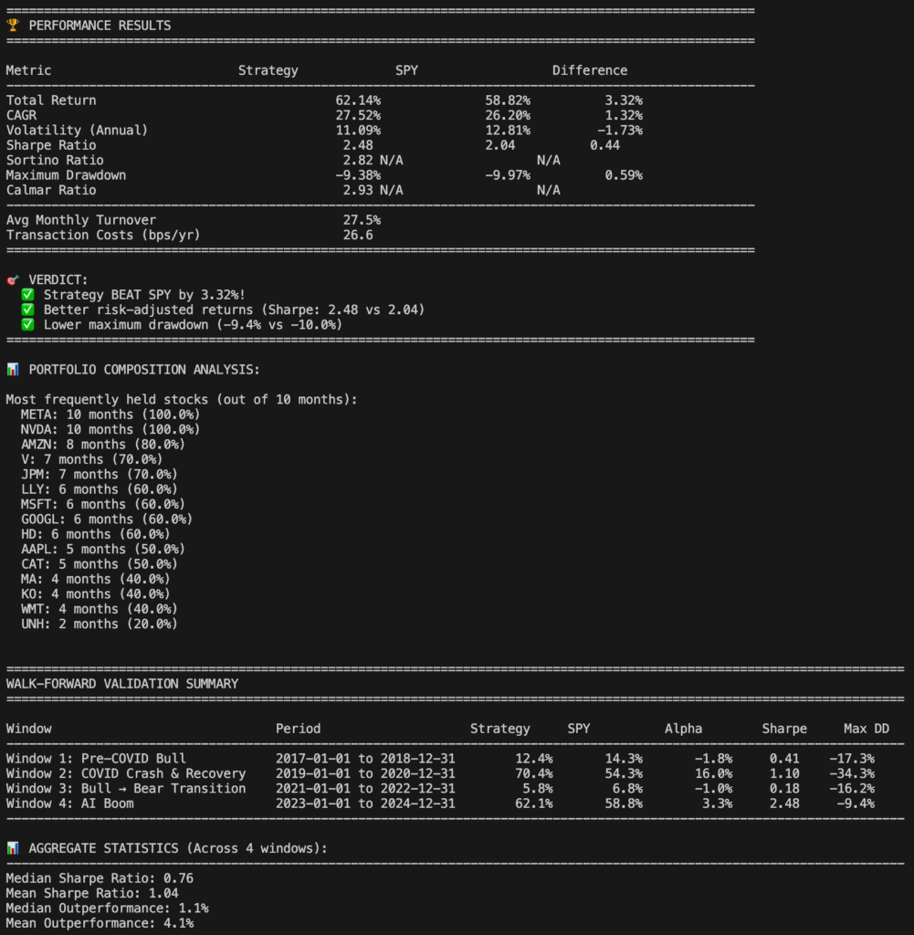 Experiment #1: The “Safety First” Hybrid Model. I decided to make my bot more defensive. I dialed back the aggression and added a “Low Volatility” factor, rewarding stable, boring stocks. The result? It worked perfectly during the 2022 bear market! But… it completely neutered my returns during the AI boom, underperforming SPY by a painful 13.8%. The cure was worse than the disease.