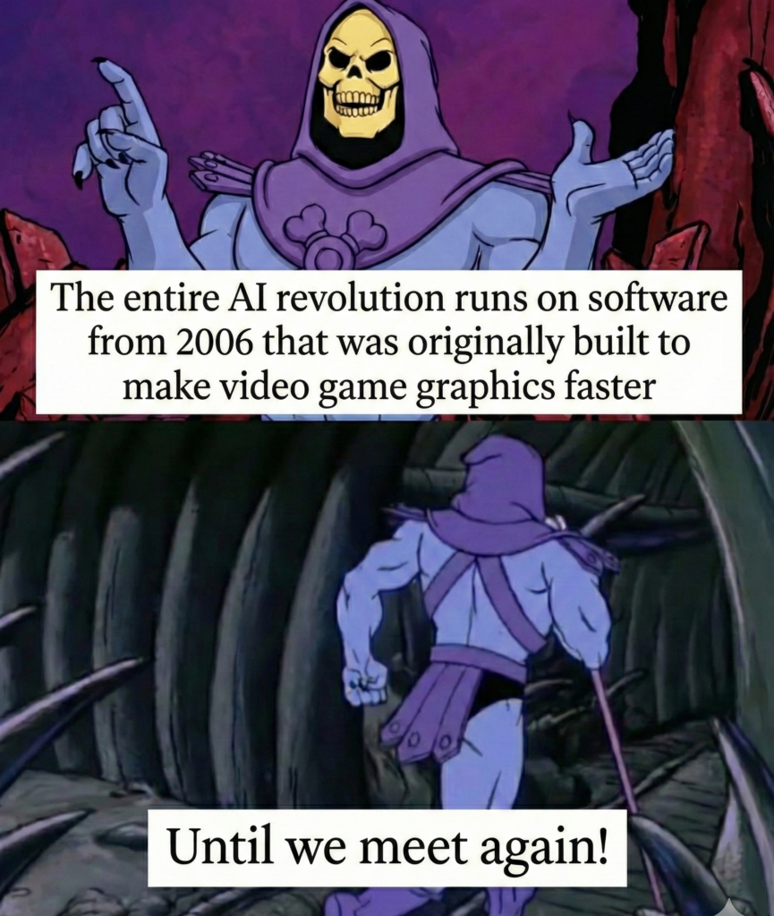 GPU (Graphics Processing Unit): Originally built to render video game pixels. Thousands of tiny cores doing simple math in parallel. Researchers in the 2000s realized “wait, neural networks are basically billions of simple math operations in parallel” and started hijacking GPUs for AI. NVIDIA noticed and leaned into it hard. The rest is history.